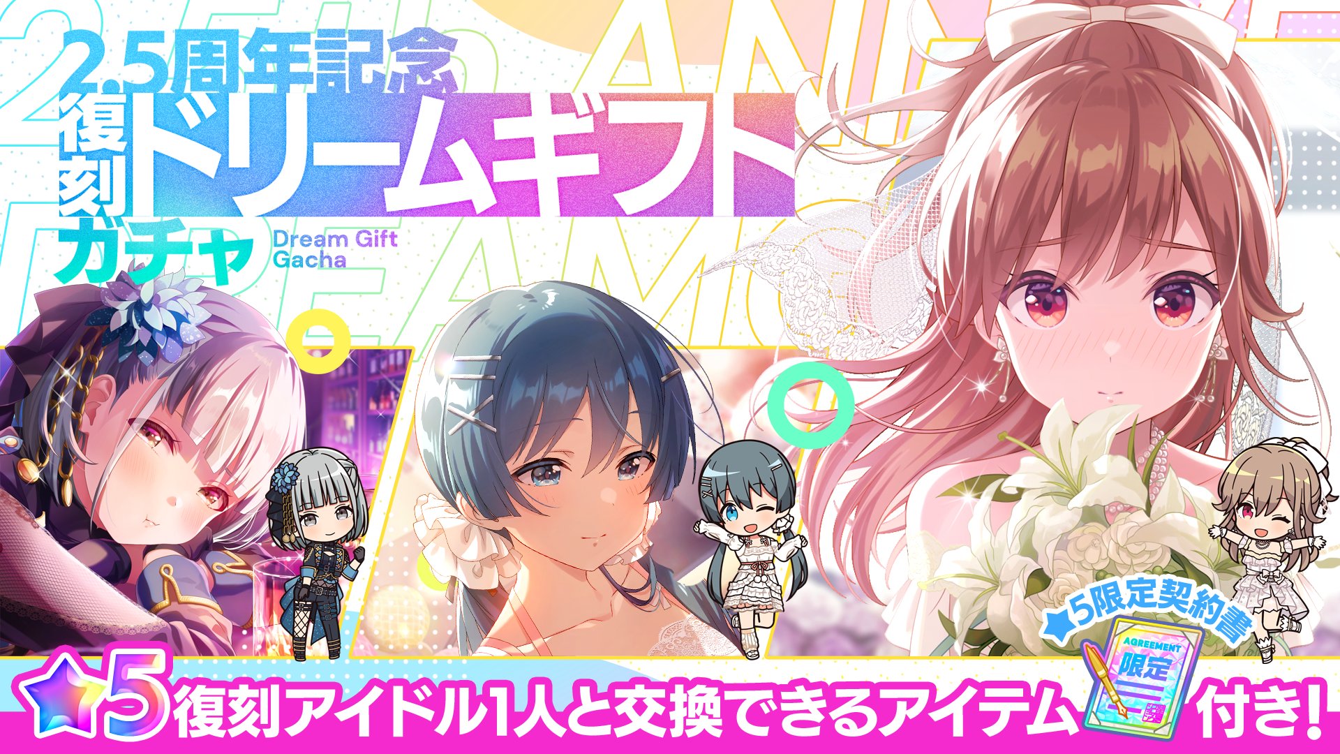 ドリームギフトガチャはブルーダイヤ(有償ダイヤ)を使って引くガチャです。ガチャ自体は対象の限定アイドルが排出されるような限定ガチャですが、これに付随する「★5限定契約書」が目玉アイテムです。