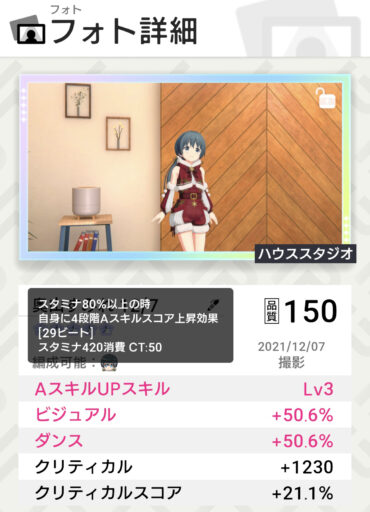 例えば以下のすみれの限定フォトである「AスキルUPスキル」の項目をタップするとスキルの詳しい説明が表示されます。