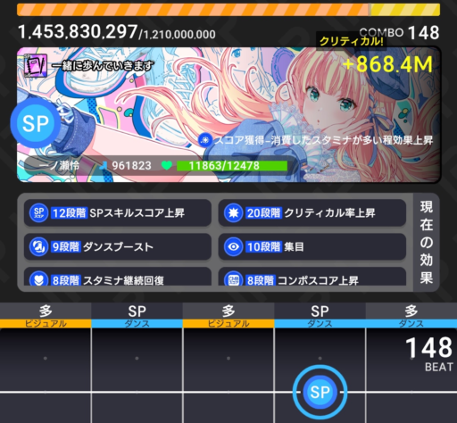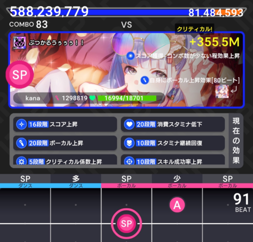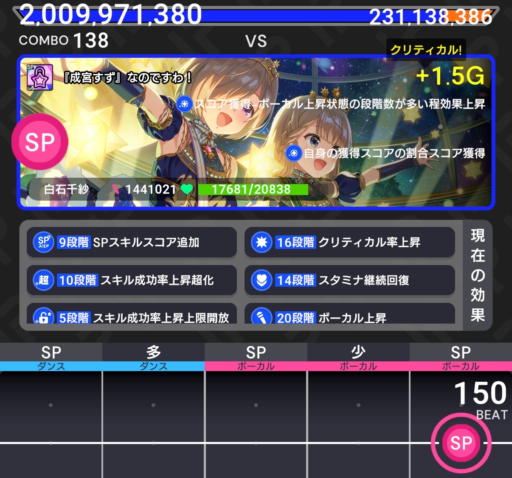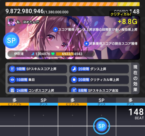 ステージレベルが上ってくるとSPスキル時のクリティカルが発生しづらくなるので、スコアを直接伸ばしていくスキルとクリティカル率上昇スキルを良いバランスで組むことが重要で、かつそれが難しい点でもあります。