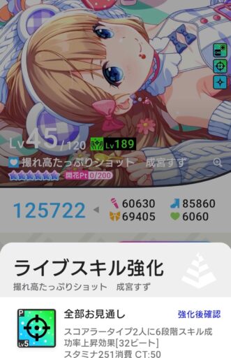 例えば以下の[撮れ高たっぷりショット]成宮すず(通称:くますず)ではPスキル1つ目にCT50でスコアラータイプ2人へのスキル成功率上昇効果が32ビート継続するようなスキル、Pスキル2つ目にCT50でダンスが高い2人に7段階スコア上昇効果が54ビート継続するというスキルを持っています。