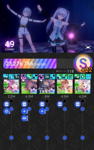 1枚目の画像は1ビート目が過ぎてすぐの状態です。くますずの1つ目のPスキルが発動しており、CTのカウントを見ると49となっています。