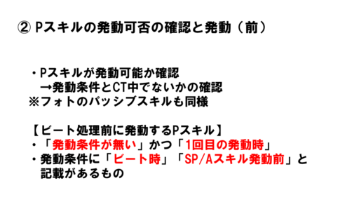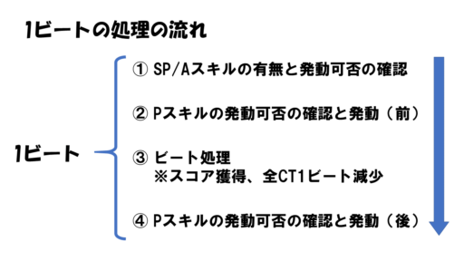 そのため、本来は1ビート目のビート処理前に両方のPスキルが発動しそうですが、1ビート1スキルの原則があるので2つ目のPスキルは2ビート目のビート処理前の発動に変更されます。