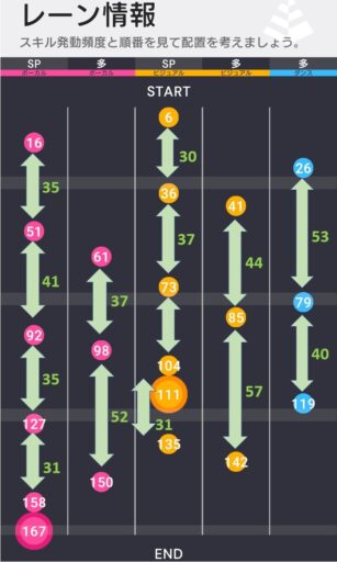 バフを付与しやすいのはセンターレーンであるため、ビジュアル主軸の編成も考えられる一方で、Aスキルスコア倍率が3.0倍の設定であり、Aスキル豊富な譜面であることから全体的なスキル獲得も重要となってくる。