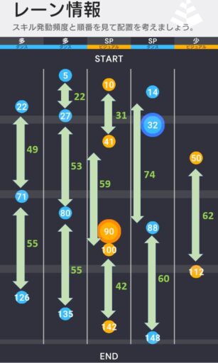 センターレーン、特にSPスキルへのバフを乗せづらく場合によってはCTカット系のアイドルも活躍する譜面となっている。