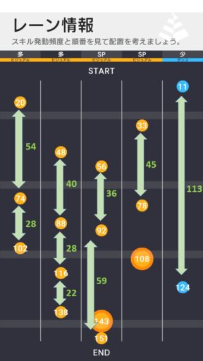 左2レーン目はスキルがかなり詰まっているが、相手よりもステータスが勝っており、両者ともAスキル1つ持ちアイドルの場合は116ビートが相手、138ビートのAスキルは自分が獲得できる状況になるので、この点は抑えておきたい。
