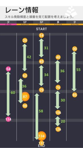 右2レーンは106ビートと126ビートの間隔が20ビートであるので、Aスキル2個持ちアイドルの編成でない限りは両者が1つずつスキルを分け合うこととなる。