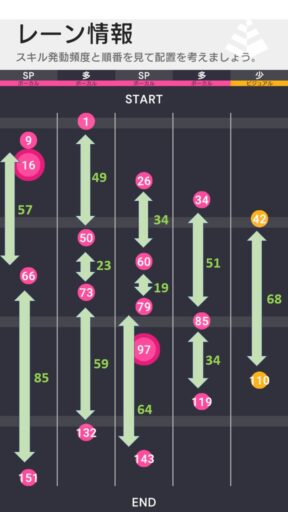 また、左2レーンの73ビート、センターの79ビートは共に直前のビートから30ビートの間隔が開いていないため、Aスキル2個持ちアイドルやCT減少アイドルを編成しない限りは相手とスキルを分け合う格好となることに注意したい。