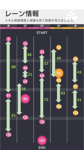 こころの自己バフと千紗のバッファータイプへのボーカルバフは48ビート目のAスキルには乗らないため、左2レーン目は10ビート目と69ビート目が獲得しやすい。