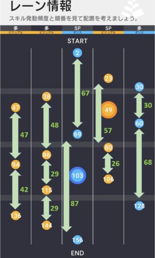 フェス葵が最も効果的に編成できるのは左2レーン目であり、ビジュアルSP直前でビジュアル低下効果を付与することができる。