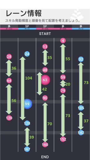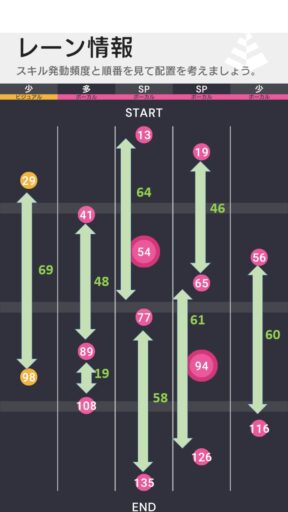 こちらも普段のバトルライブとは異なり、SPスキルにバフを集中させるのではなく、単体でもレーン確保能力が高いアイドルを編成し、全体的なスキル確保に繋げられるかが勝負の鍵となる。