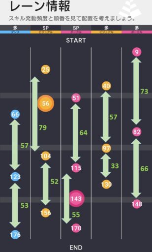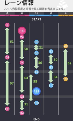 左2のすずはAスキルスコアで稼ぐタイプのスコアラーであり、今回の譜面とは相性が良い。ただし、すずのSPスキルを発動すると自身に20段階のスタミナ上昇効果が付与されるため、後半のスキル獲得が難しい側面もある。(すみれのスタミナ回復スキルはなるべくレベルを上げておきたい。)