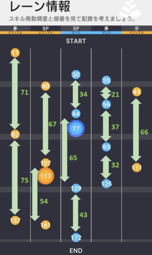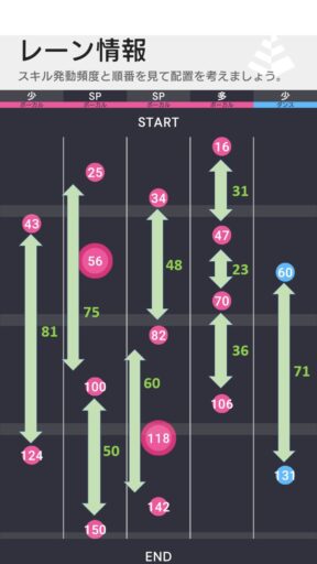 ダンスレーン勝負、ビジュアルレーン勝負とするかで大きく編成が変わってくるがスコアが稼ぎやすいのはビジュアルSPレーンである一方で、ダンスレーンはAスキルも多く、ここにビジュアルアイドルを編成してしまうとほぼ全て相手にスキルを渡してしまうこととなる。そのためバランスの取れた編成も考えられ、編成の幅がかなり広い譜面となっている。