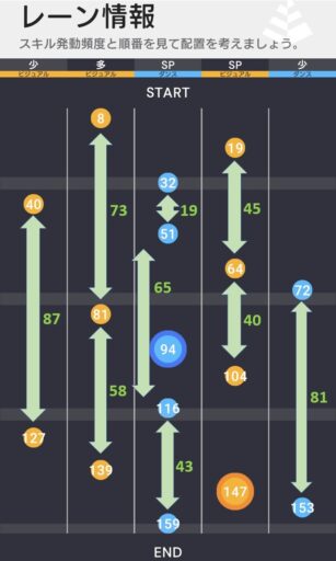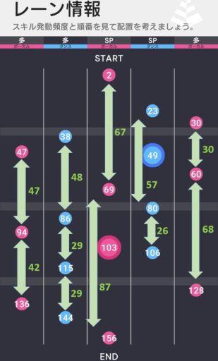 ライブボーナスは誰かがAスキルスコア上昇状態の時、スコアラータイプ2人に7段階スキル成功率上昇効果となっている。右2レーン目のダンスSPはライブボーナスを乗せづらいことに加えて高スコアも狙いづらい配置となっている。そのため、センターSPに特化した編成が推奨される。