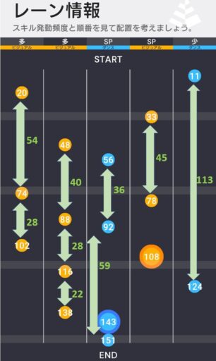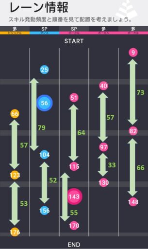 また、譜面間隔が狭い部分が多いため、Aスキル1個持ちアイドルを編成する場合はスキルを相手と分け合う形になりやすいことに注意したい。