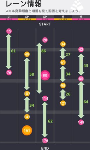 右2レーン目は譜面間隔が狭いため、自身がAスキル1個持ちアイドルを編成する場合には相手アイドルにスキルを取られることを意識した編成を考えたい。