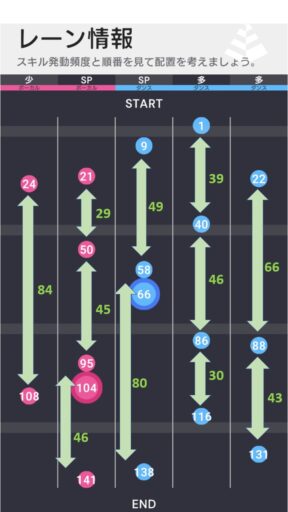 左2レーン目のSPスキルはバフを乗せづらい配置となっており、基本的にはセンターレーンのSPスキルで大きく稼ぐことが勝負の鍵となる。最左のビジュアルレーンはAスキルがSPスキルに直接効果をもたらす配置ではないため、Pスキルで活躍ができるアイドルを属性関係なく配置するように心がけたい。